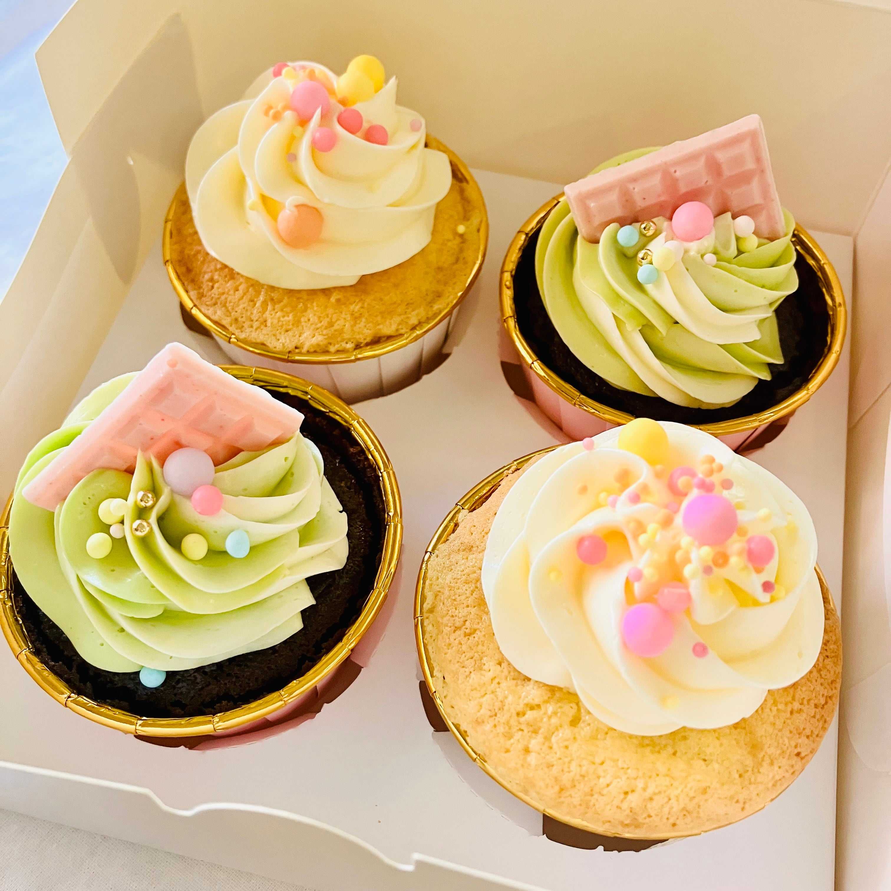 ふんわりとした口当たりのカップケーキに、当店の独自の配合でお作りしたあっさりとしたバタークリームをたっぷりとお絞りしています。
