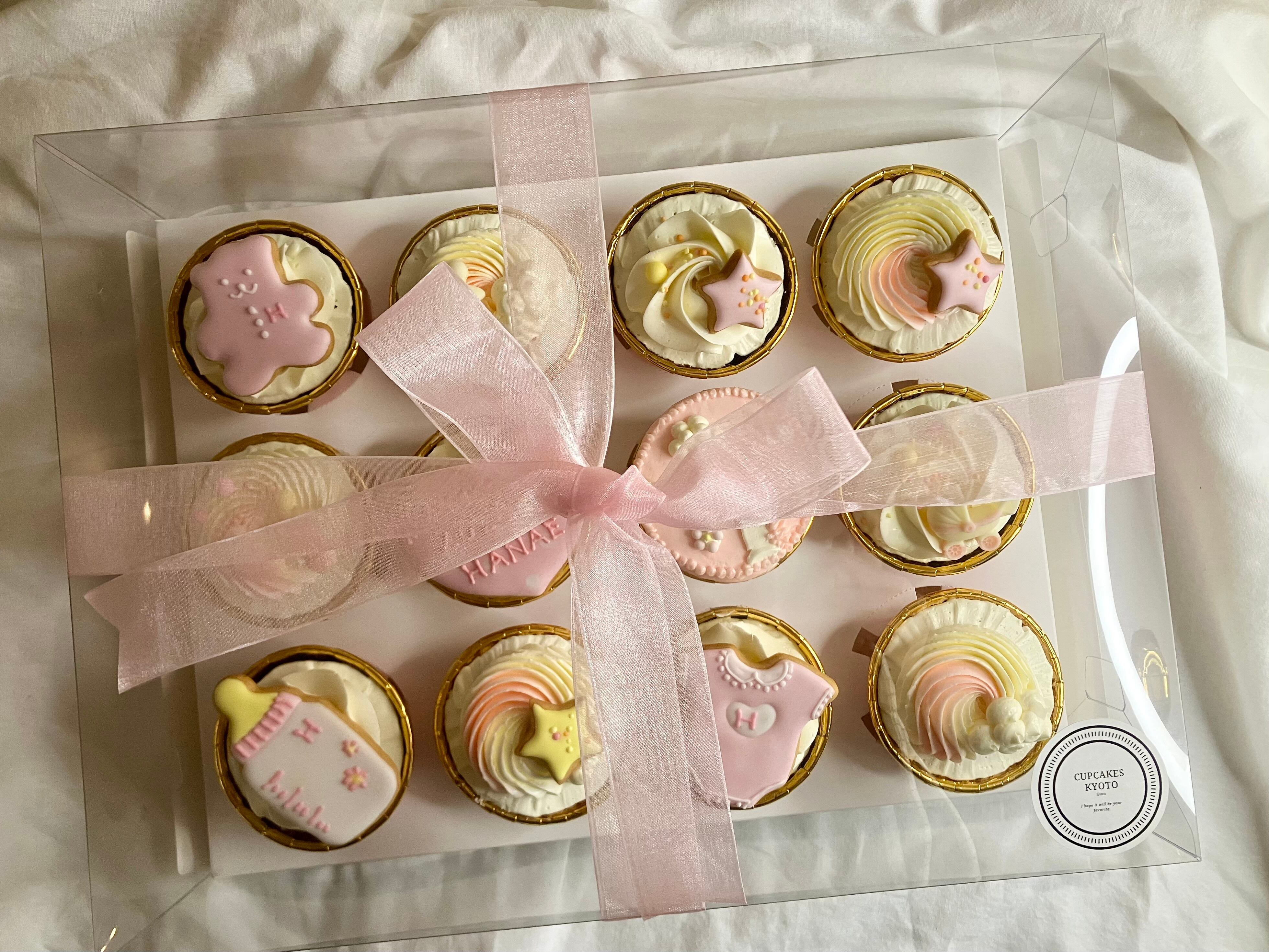 バニラビーンズを使用したふわふわバニラスポンジとミルキーなバタークリームを、乳児のやさしいぬくもりを想わせる淡い色合いと、赤ちゃんの必須アイテムをデコレーションで包んだ、写真映え抜群のカップケーキ12個セット。