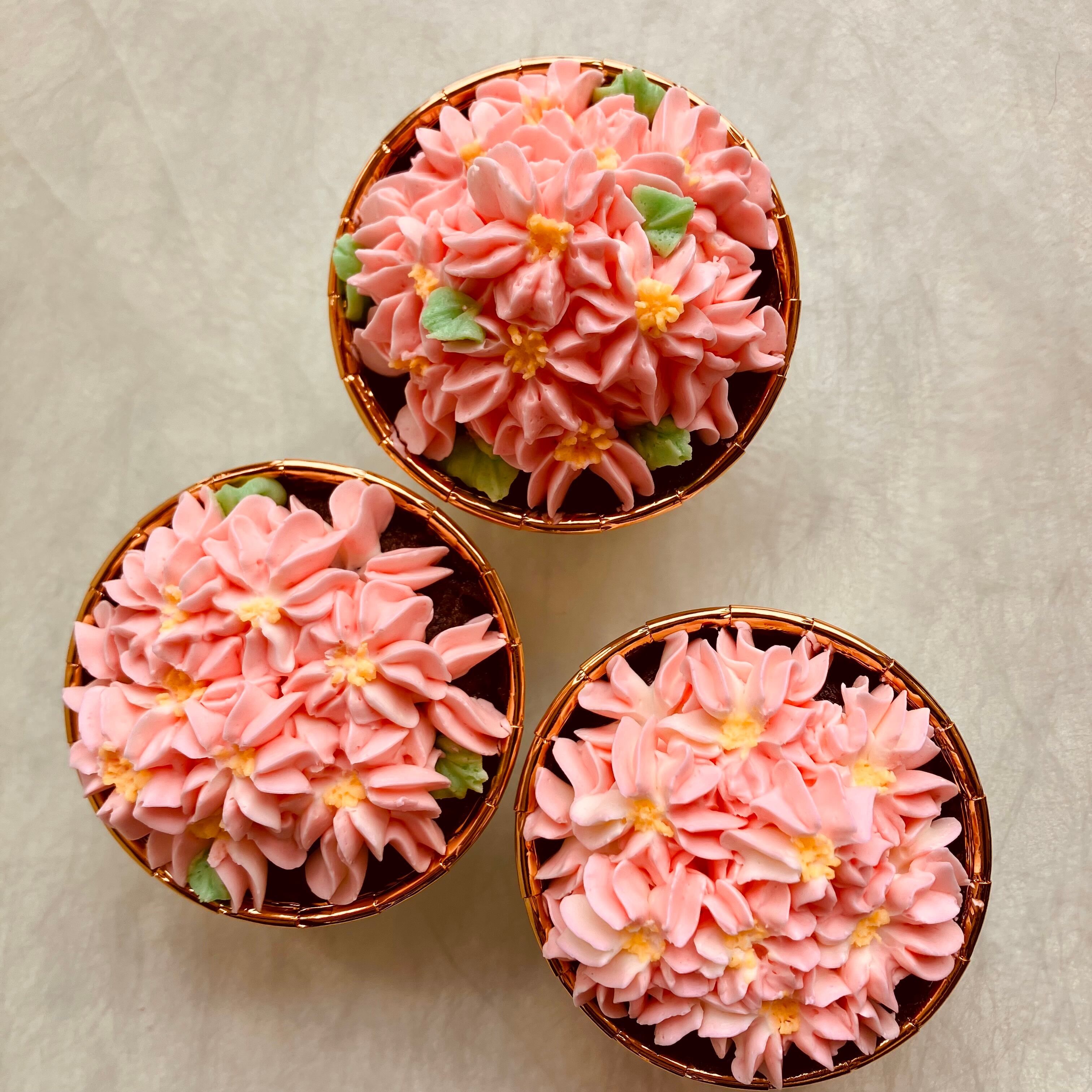 1つ目は宇治のほうじ茶を使用した和の風味のスポンジと桜香るバタークリームを桜のお花のように絞りました。フィリングには桜あんを詰めています。×3